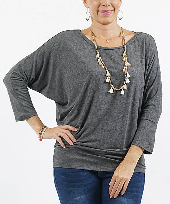 A neutral shade makes for easy mixing and matching with this soft, stretchy dolman-sleeve top.