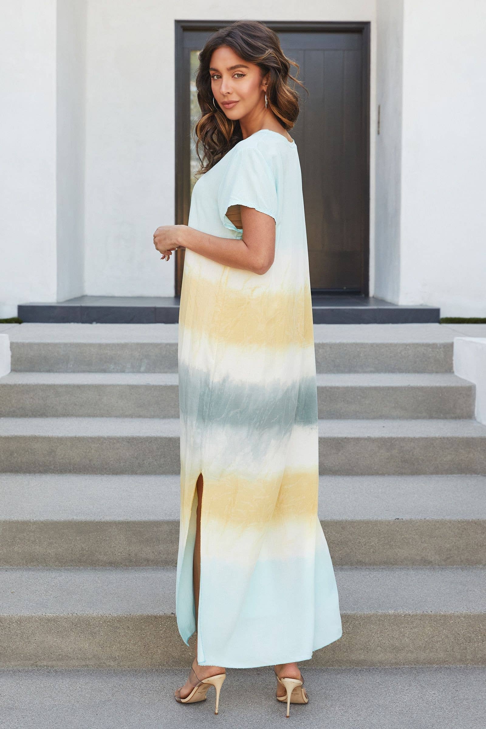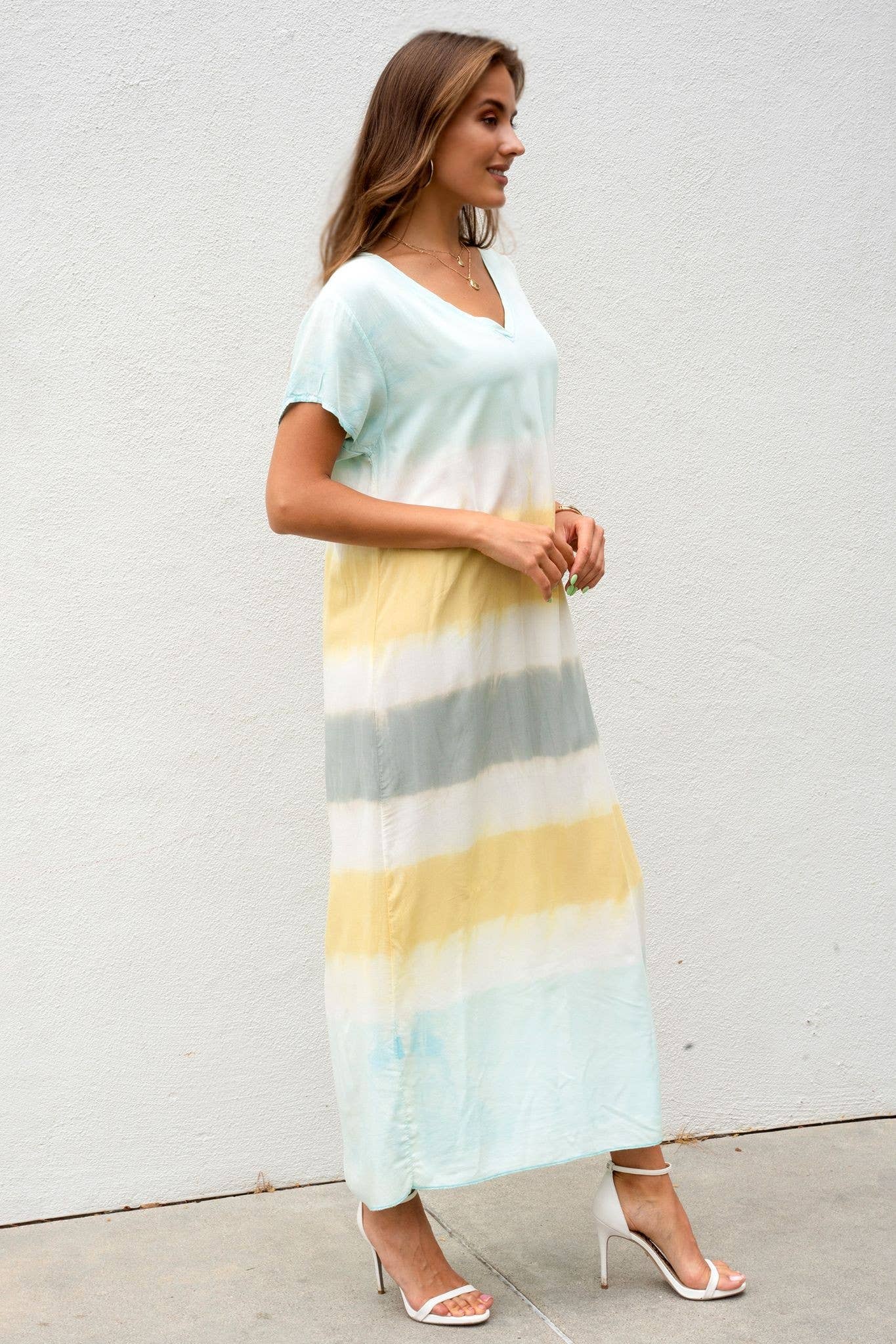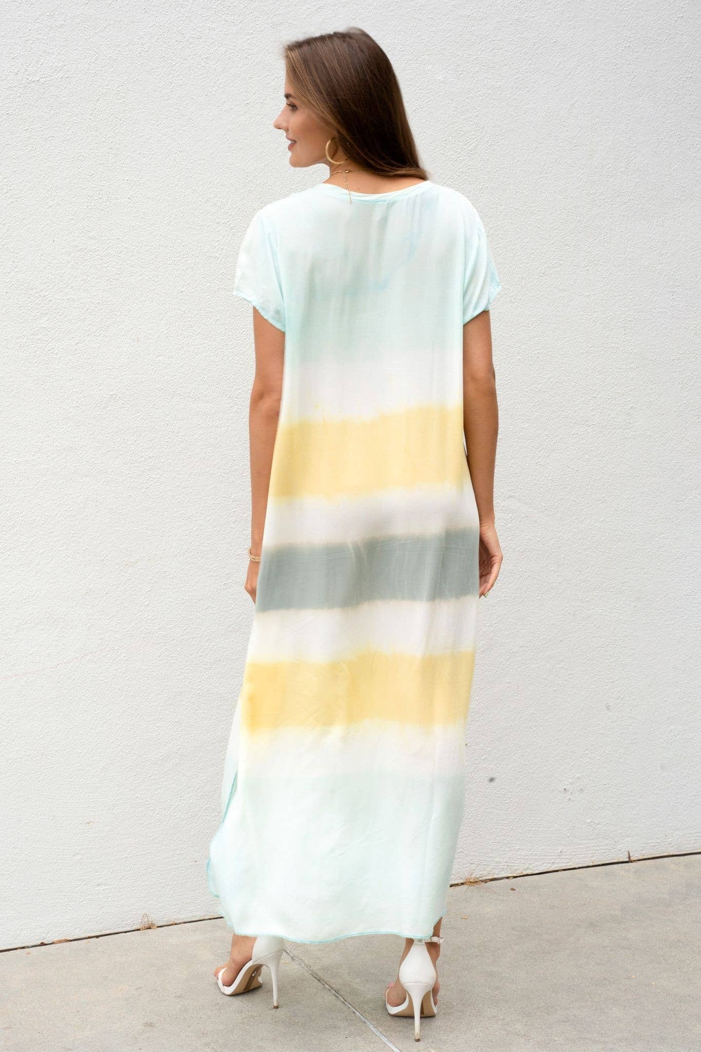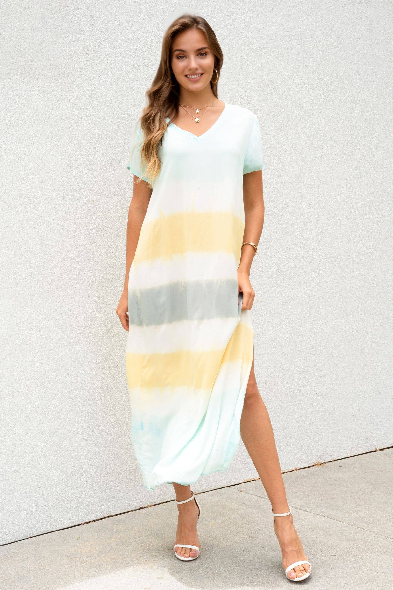 STRIPE TIE DYE V-NECK SHORT SLEEVE ITALIAN MAXI DRESS WITH SIDE SLIT