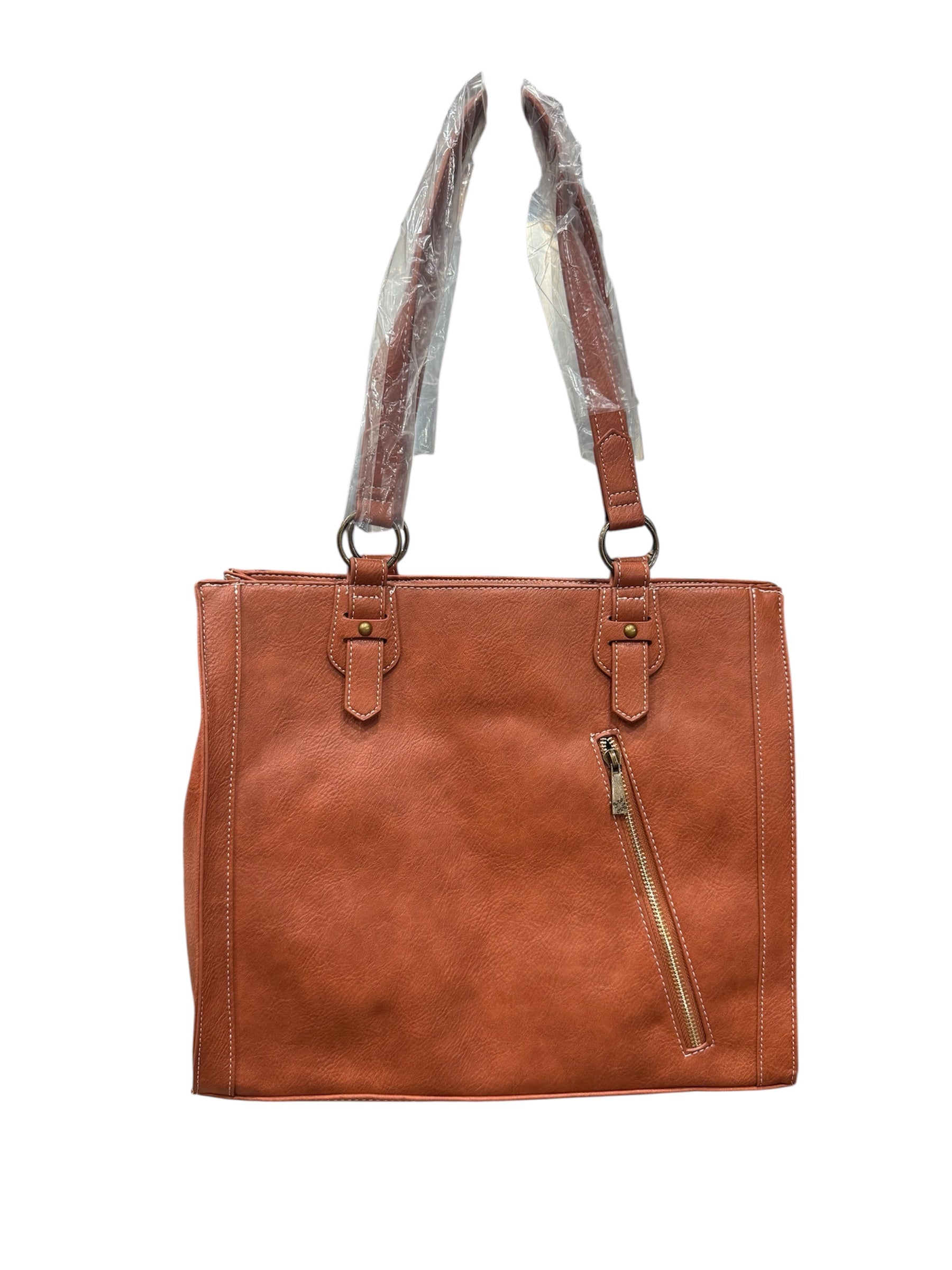 Product Details 1 compartment 2 slip pockets 1 zipper pocket Magnetic snap closure 1 Concealed carry pocket Specifications Width: 14.25" Depth: 6.25" Height: 11" Drop Length: 11"