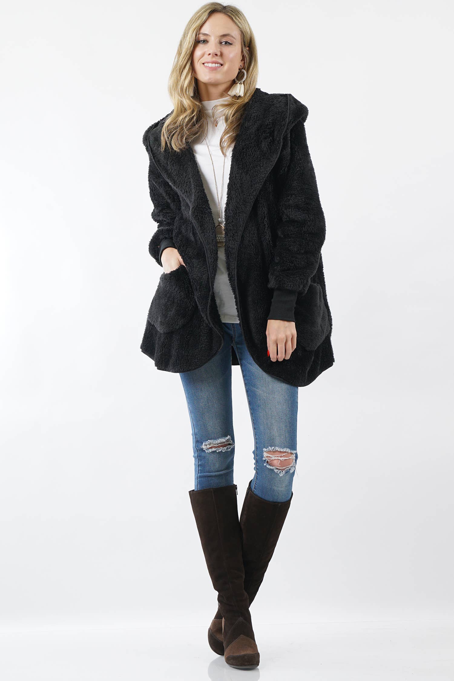 SI-15234 Faux fur cocoon jacket with pockets (100% polyester)