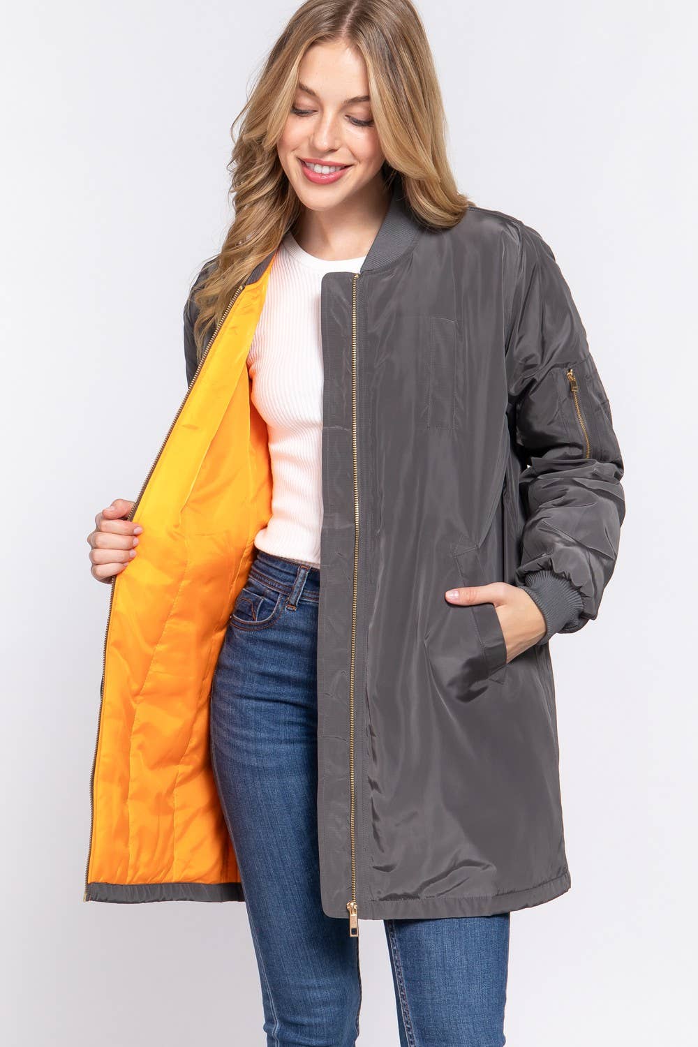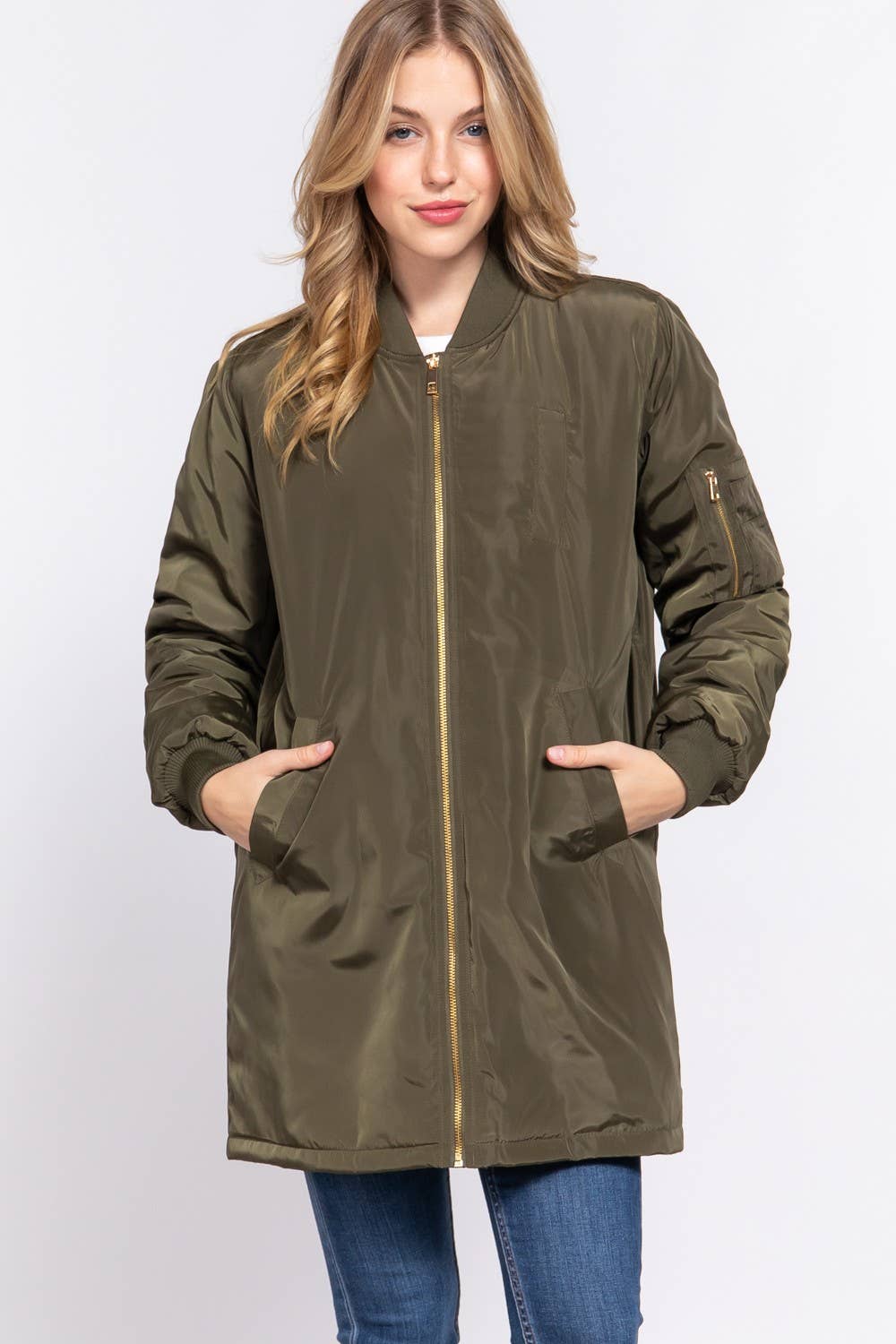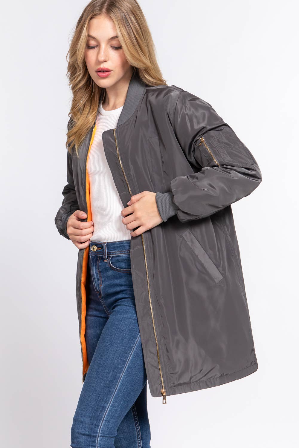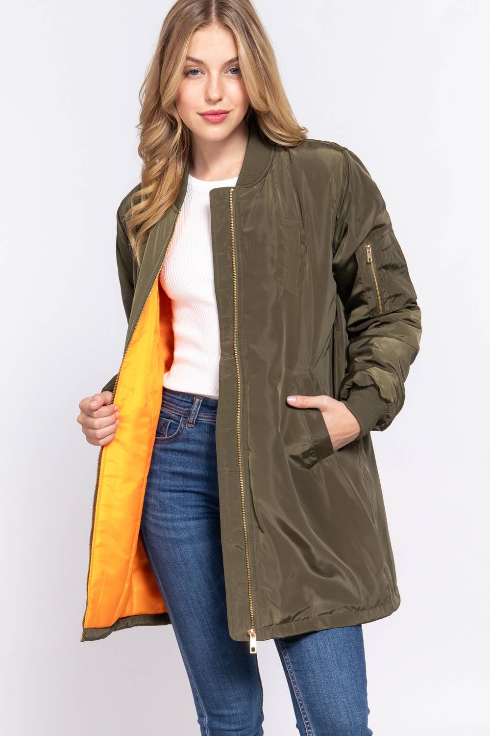 - sale, markdown, active basic, active usa, bomber, fall, winter, cool casual, casual, long, zipper, zip-up, zip up, trending, comfy, comfort, comfortable, warm, woven, flight, airline, oversize