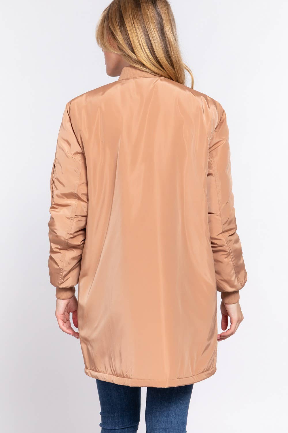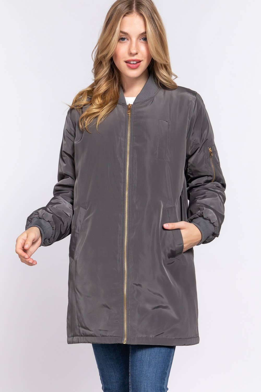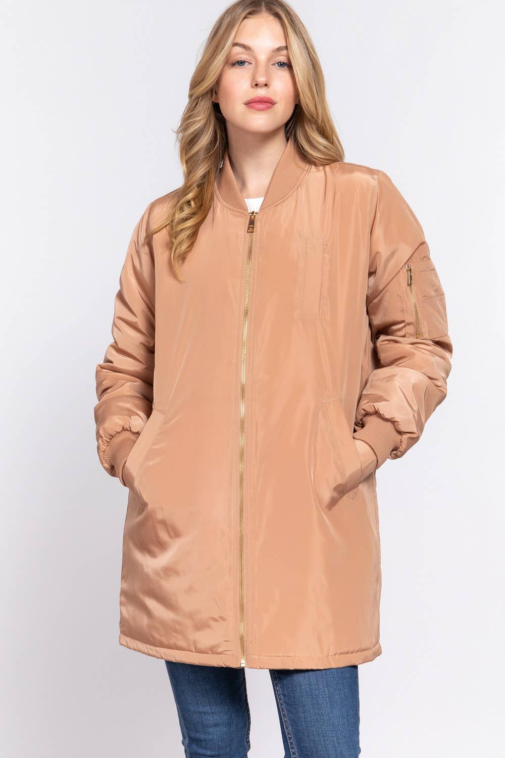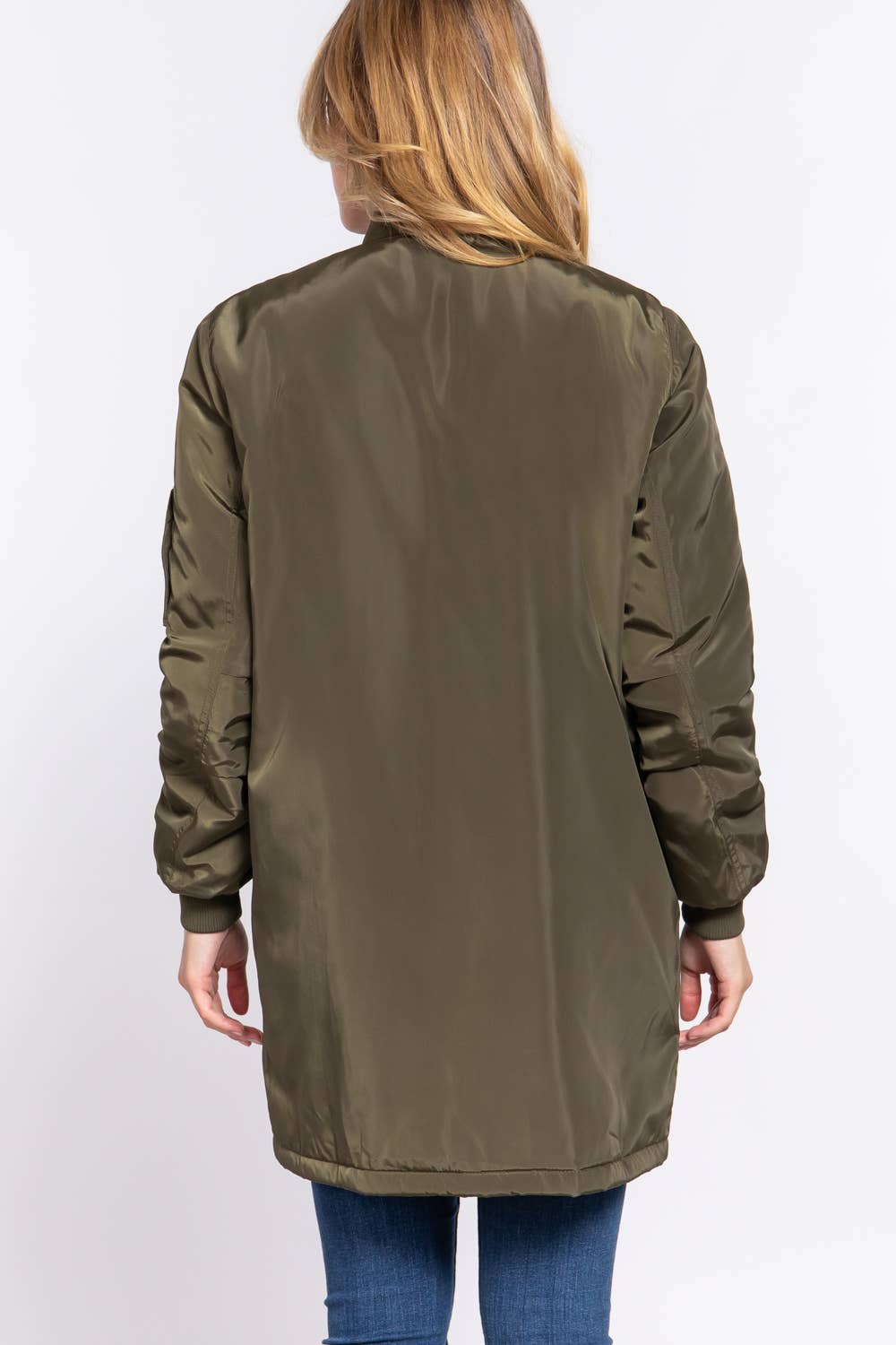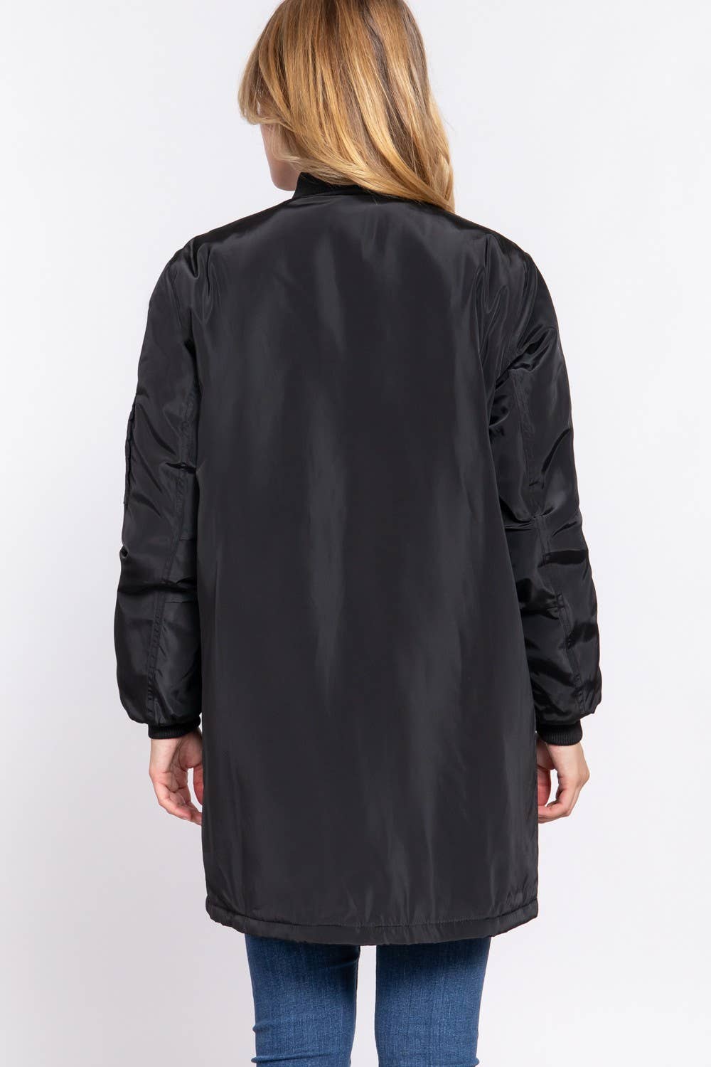 - sale, markdown, active basic, active usa, bomber, fall, winter, cool casual, casual, long, zipper, zip-up, zip up, trending, comfy, comfort, comfortable, warm, woven, flight, airline, oversize