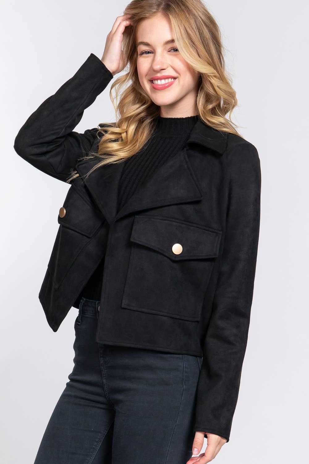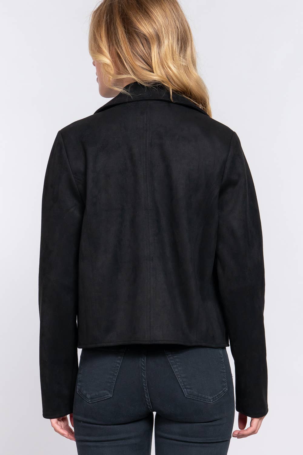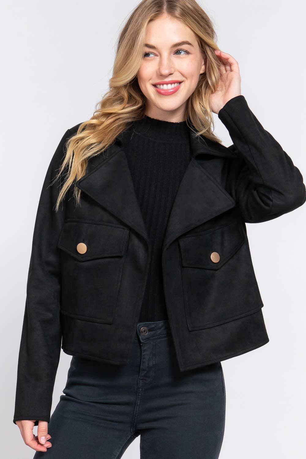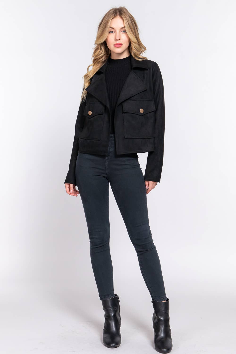 LONG SLEEVE NOTCHED COLLAR POCKET DETAIL OPEN FRONT FAUX SUEDE JACKET