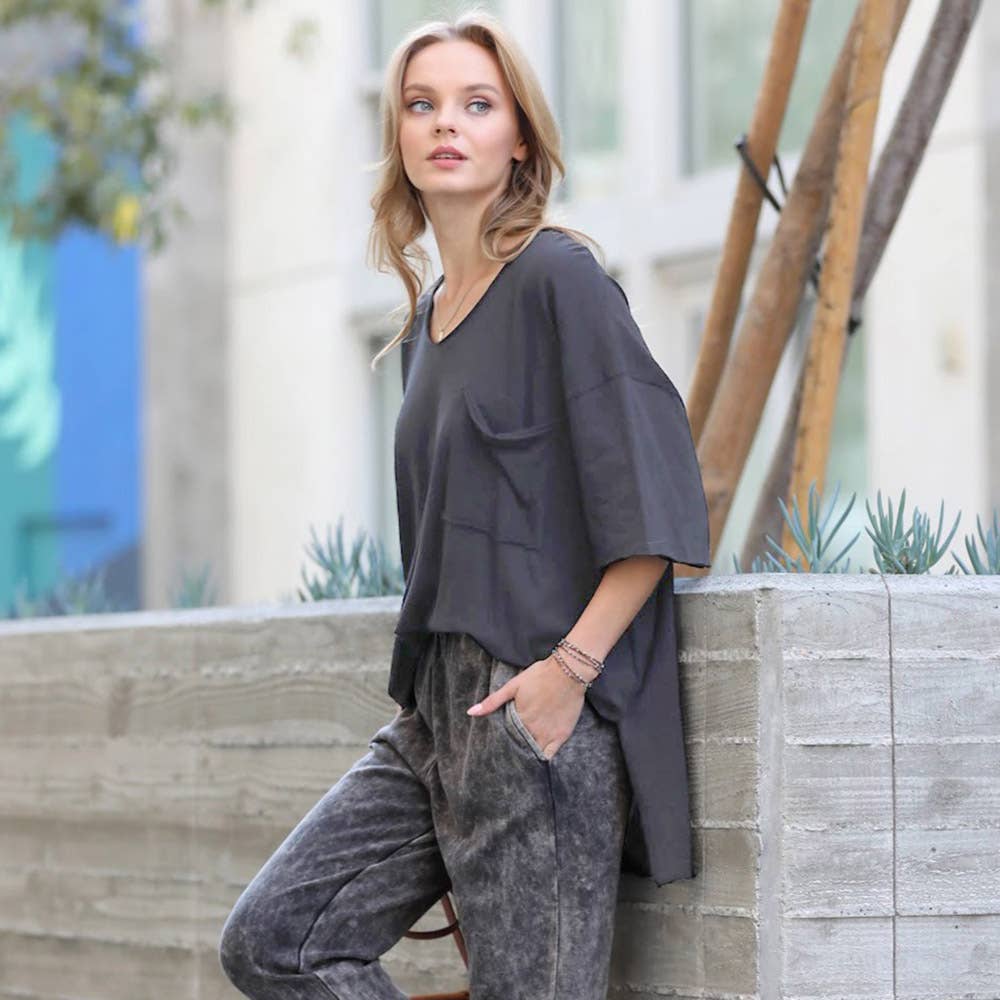 SI-25555 Tri Blend Oversized Front Pocket Raw Edge Boyfriend Tee (50% POLYESTER 25% COTTON 25% RAYON)