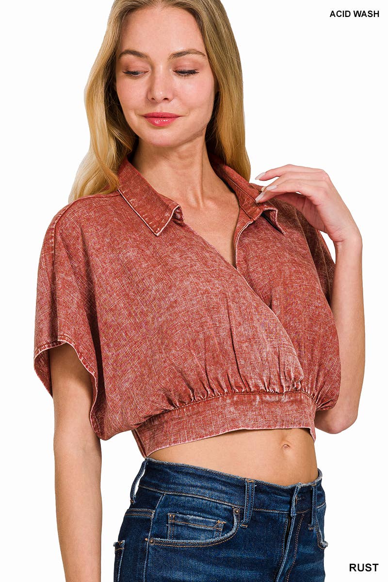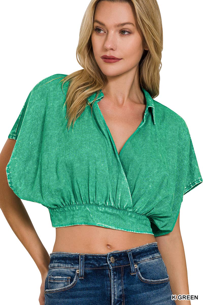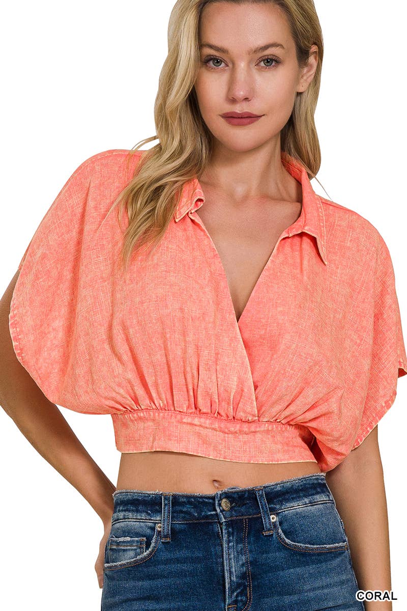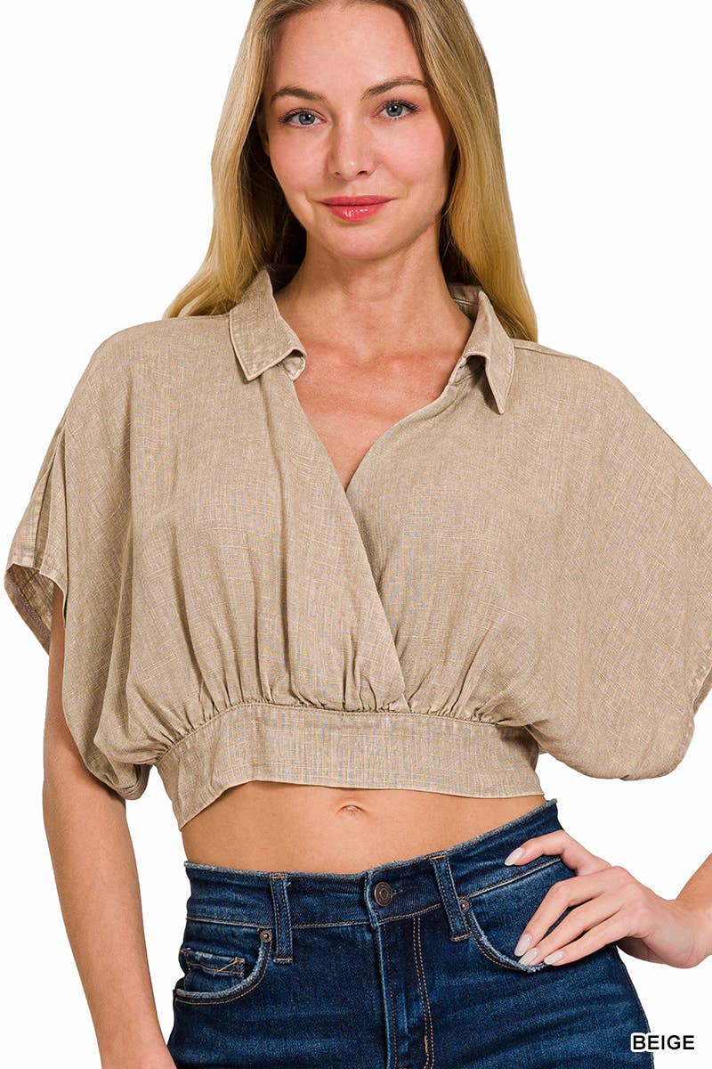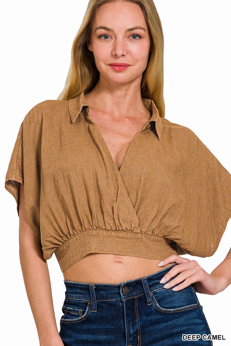 SI-25875 Washed Linen Banded Hem Surplice Cropped Top