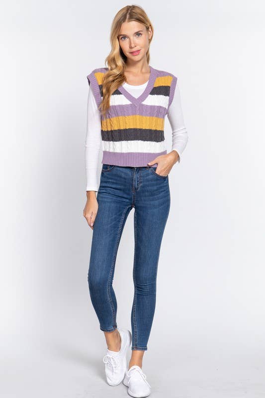 Sleevelesss V-neck Striped Cable Sweater Vest
