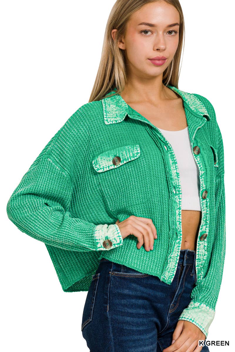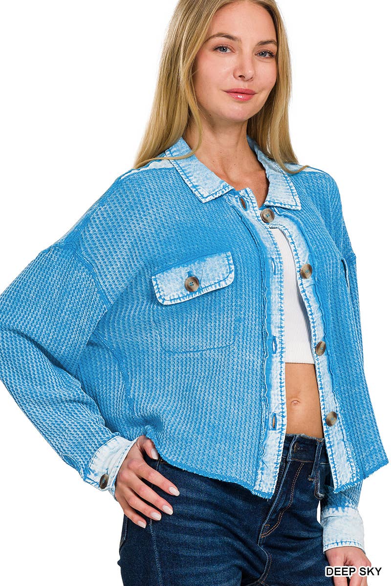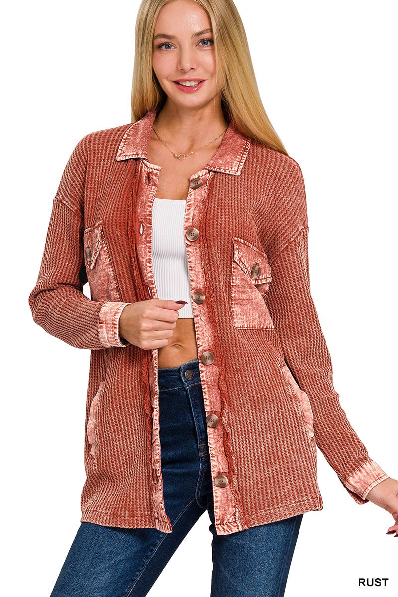 ',....Waffle Acid Wash Oversized Shacket Reg/Crop